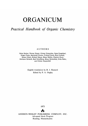 Buku Organicum: Practical Handbook of Organic Chemistry disusun oleh Heinz Becker bersama rekan-rekan seperti Werner Berger dan Günter Domschke sebagai buku pegangan komprehensif dalam kimia organik yang bersifat praktis dan teoretis. Becker dan kolega berasal dari latar belakang akademik ilmu kimia dengan pengalaman di laboratorium dan pendidikan organik, sehingga buku ini menyajikan kandungan yang kaya akan panduan hands-on dalam praktik organik. Fokus utamanya adalah pada penjelasan teknik-teknik laboratorium dasar dan lanjutan — seperti penggunaan peralatan standar, pemanasan cairan mudah terbakar, distilasi sederhana, dan kromatografi kolom — serta pembahasan dasar mekanisme reaksi dan sintesis organik yang umum digunakan di laboratorium kimia.