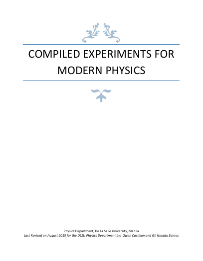 Modern Physics Laboratory Manual lv3 Compiled Experiment for Modern Physics merupakan panduan praktikum fisika modern yang disusun oleh Gwen Castillon dan Gil Nonato Santos untuk kegiatan laboratorium fisika tingkat lanjut. Buku ini berisi kumpulan eksperimen fisika modern yang mencakup topik seperti difraksi dan interferensi cahaya, interferometer Michelson, indeks bias material, spektrum atom, difraksi elektron, efek fotolistrik, konstanta Planck, hingga radiasi dan struktur atom. Materinya disusun secara sistematis meliputi tujuan percobaan, landasan teori, prosedur eksperimen, teknik pengukuran, analisis data, serta evaluasi hasil percobaan untuk membantu mahasiswa memahami konsep fisika modern melalui pendekatan eksperimen langsung di laboratorium.