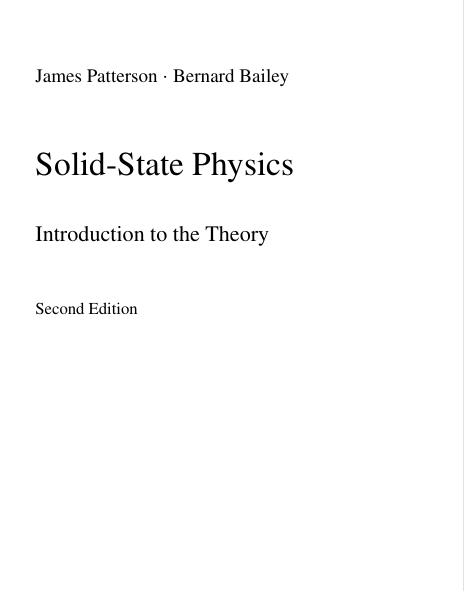 Buku Solid-State Physics: Introduction to the Theory edisi ke-2 merupakan buku teks fisika yang ditulis oleh James D. Patterson dan Bernard C. Bailey yang membahas teori dasar fisika zat padat secara sistematis. Buku ini menguraikan konsep-konsep utama seperti struktur kristal, difraksi, getaran kisi, teori pita energi, sifat elektronik material, semikonduktor, serta fenomena magnetik dalam padatan. Materinya disajikan dengan pendekatan matematis dan teoritis yang kuat disertai penjelasan konsep fisika modern, sehingga membantu pembaca memahami perilaku mikroskopik partikel dalam material padat.