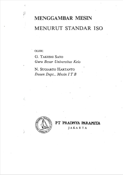 Buku Menggambar Mesin Menurut Standar ISO ditulis oleh G. Takeshi Sato dan N. Sugiarto Hartanto, serta diterbitkan oleh Pradnya Paramita di Jakarta. Buku ini membahas secara sistematis prinsip dan dasar-dasar menggambar teknik mesin yang mengikuti standar internasional ISO. Materi di dalamnya mencakup aturan dasar penyajian gambar teknik, cara pemberian ukuran, penggunaan simbol dan standar gambar, serta alat-alat yang digunakan dalam proses pembuatan gambar teknik. Melalui penjelasan yang dilengkapi dengan berbagai contoh ilustrasi, buku ini membantu pembaca memahami bagaimana menyusun gambar teknik yang jelas, presisi, dan dapat dipahami secara universal dalam dunia teknik. Dalam praktiknya, gambar teknik sering disebut sebagai “bahasa teknik” karena menjadi sarana komunikasi utama antarinsinyur dalam menyampaikan ide dan rancangan mekanik.
