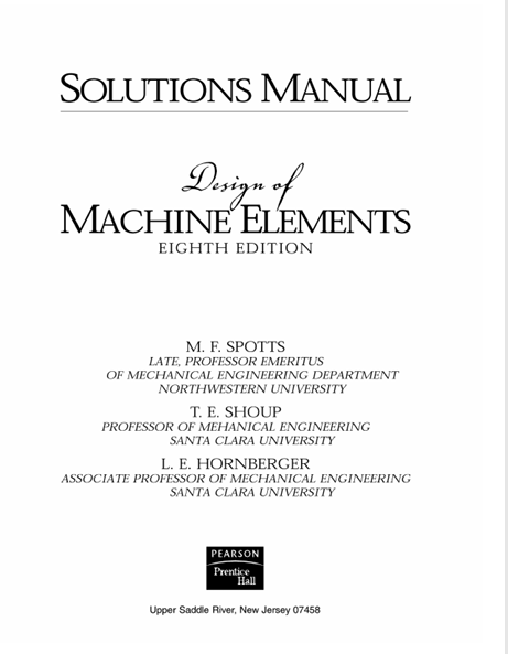 Buku Solutions of Design of Machine Elements 8th Edition berkaitan dengan buku utama Design of Machine Elements yang ditulis oleh M. F. Spotts, T. E. Shoup, dan L. E. Hornberger. Buku solusi ini berfungsi sebagai panduan penyelesaian soal-soal yang terdapat dalam buku utama mengenai perancangan elemen mesin. Materi yang dibahas mencakup berbagai prinsip dasar desain mekanik seperti analisis tegangan dan teori kegagalan, perancangan poros, pegas, baut dan sambungan, sabuk dan rantai transmisi, bantalan, serta berbagai jenis roda gigi. Buku ini juga menampilkan pendekatan analitis dan contoh perhitungan terstruktur yang membantu pembaca memahami proses desain komponen mesin secara sistematis serta bagaimana konsep mekanika dan kekuatan material diterapkan dalam perancangan mesin.