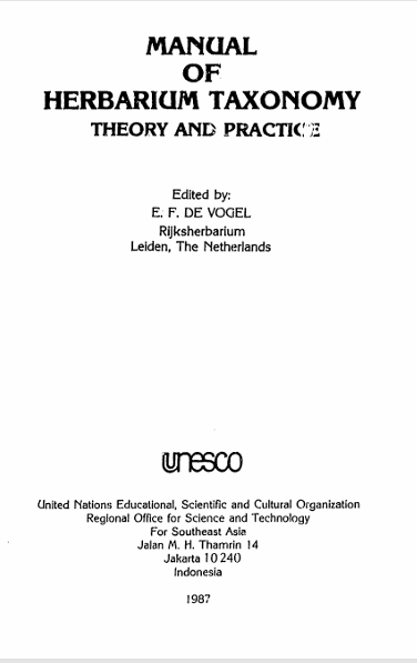 Buku Manual of Herbarium Taxonomy: Theory and Practice disunting oleh E. F. de Vogel, seorang ahli botani yang berperan dalam pengembangan sistematika tumbuhan dan pengelolaan herbarium. Buku ini diterbitkan oleh UNESCO pada tahun 1987 dan menjadi panduan penting dalam bidang taksonomi tumbuhan berbasis herbarium. Isinya mencakup prinsip-prinsip dasar taksonomi, teknik pengumpulan spesimen, metode deskripsi tumbuhan, serta pengelolaan koleksi herbarium. Selain itu, buku ini juga membahas konsep klasifikasi, nomenklatur, dan analisis karakter tumbuhan yang digunakan dalam identifikasi serta studi keanekaragaman hayati :contentReference[oaicite:0]{index=0}.