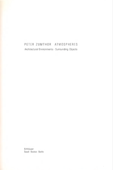 Buku Atmospheres: Architectural Environments – Surrounding Objects ditulis oleh Peter Zumthor, seorang arsitek asal Swiss peraih Pritzker Prize yang dikenal dengan pendekatan desain yang menekankan pengalaman indrawi dan suasana ruang. Buku ini merupakan hasil refleksi pemikiran Zumthor yang disusun dalam bentuk sembilan bab singkat berdasarkan proses kreatifnya dalam merancang bangunan. Isinya berfokus pada konsep “atmosfer” dalam arsitektur, yaitu bagaimana ruang dapat menghadirkan perasaan tertentu melalui elemen seperti material, cahaya, suara, proporsi, dan hubungan dengan lingkungan sekitar. Buku ini menekankan bahwa arsitektur tidak hanya soal fungsi, tetapi juga tentang menciptakan pengalaman emosional dan kualitas ruang yang mendalam. .