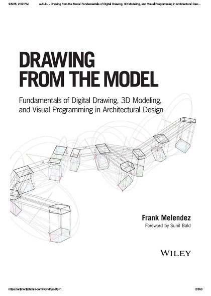 Buku Drawing from the Model: Fundamentals of Digital Drawing, 3D Modeling, and Visual Programming in Architectural Design ditulis oleh Frank Melendez, seorang akademisi dan praktisi di bidang arsitektur yang berfokus pada desain digital dan komputasional. Buku ini membahas secara komprehensif perkembangan teknik representasi arsitektur dari metode gambar manual (analog) hingga pendekatan digital modern. Isinya mencakup dasar-dasar gambar arsitektur, pemodelan 3D, serta penggunaan visual programming untuk desain parametrik dan algoritmik. Selain itu, buku ini juga memperkenalkan berbagai perangkat lunak seperti Rhino, Grasshopper, dan Adobe Illustrator, serta teknik simulasi dan fabrikasi digital yang digunakan dalam praktik arsitektur kontemporer. .