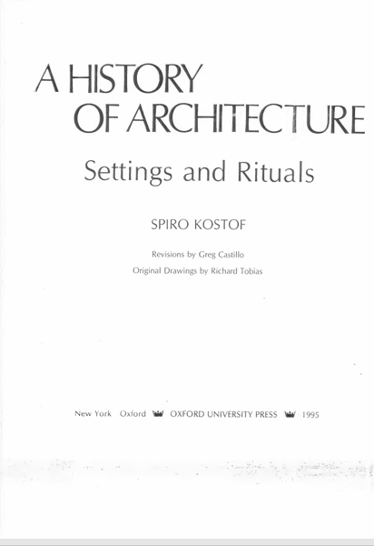 Buku A History of Architecture: Settings and Rituals ditulis oleh Spiro Kostof, seorang sejarawan arsitektur terkemuka dan profesor di University of California, Berkeley. Buku ini merupakan karya monumental yang membahas perkembangan arsitektur dari zaman prasejarah hingga era modern dengan pendekatan yang luas dan komprehensif. Tidak hanya berfokus pada bangunan monumental, buku ini juga mengkaji berbagai jenis struktur seperti hunian, bangunan kota, hingga lanskap, serta menempatkan arsitektur dalam konteks sosial, ekonomi, dan budaya masyarakat. Kostof menekankan bahwa arsitektur merupakan refleksi dari kehidupan manusia dan institusi sosial, sehingga studi arsitektur tidak dapat dipisahkan dari sejarah peradaban manusia secara keseluruhan ..