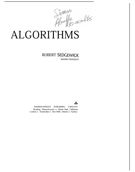 Buku Algorithms ditulis oleh Robert Sedgewick (bersama Kevin Wayne pada edisi terbaru), seorang profesor ilmu komputer di Princeton University yang dikenal luas dalam bidang algoritma dan struktur data. Buku ini merupakan salah satu referensi utama dalam studi algoritma yang membahas berbagai teknik penting seperti sorting, searching, graph algorithms, string processing, serta struktur data seperti stack, queue, dan tree. Pendekatan dalam buku ini menekankan implementasi nyata menggunakan gaya pemrograman modern serta analisis performa algoritma secara ilmiah, sehingga pembaca tidak hanya memahami konsep, tetapi juga cara penerapannya dalam sistem komputasi nyata.