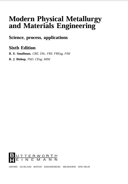 Buku Modern Physical Metallurgy and Materials Engineering: Science, Process, Applications 6th Edition ditulis oleh R. E. Smallman dan R. J. Bishop, yang merupakan akademisi terkemuka di bidang metalurgi dan material. Buku ini menyajikan pembahasan komprehensif mengenai struktur dan sifat material, khususnya logam dan paduannya, serta hubungan antara struktur mikro dengan sifat mekanik dan fisik material. Materi yang dibahas meliputi kristalografi, cacat kristal, difusi, transformasi fasa, diagram fasa, serta proses-proses manufaktur seperti pengecoran, pembentukan, dan perlakuan panas. Buku ini juga mengaitkan konsep ilmiah dengan aplikasi industri sehingga memberikan pemahaman yang menyeluruh tentang rekayasa material modern.
